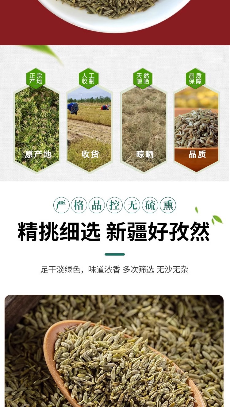 【产品描述】源自新疆的精选孜然粒,采用散装经济包装,保留了孜然最纯正的香气和品质。本产品安全健康。孜然具有独特而强烈的香味,尤其在经过高温油炸或烘烤之后,这种香味会变得更浓烈,是许多煎炸烧烤类菜肴的重要香料。特别适用于牛羊肉菜式的去膻除异增香,也常用于新疆风味菜肴和烧烤食品中。散装设计经济实惠,满足家庭和餐饮业大量使用需求,是制作烧烤、炖肉、咖喱等菜肴的理想选择。颗粒饱满,香气浓郁,是厨房中不可或