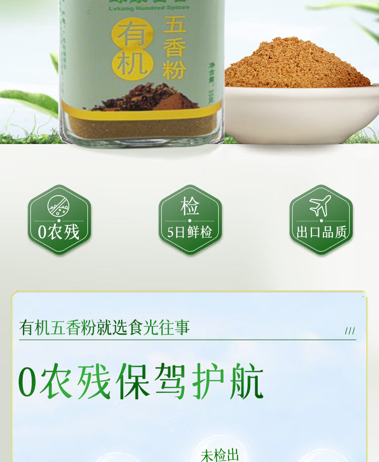 【家庭烹饪】50克有机五香粉是家庭厨房的必备调料,特别适合用于制作红烧肉、炖鸡、烤鸭等经典中式菜肴。其独特的香料配比能有效去除肉类腥味,提升食物的鲜美口感,让每一道家常菜都充满正宗的中式风味。