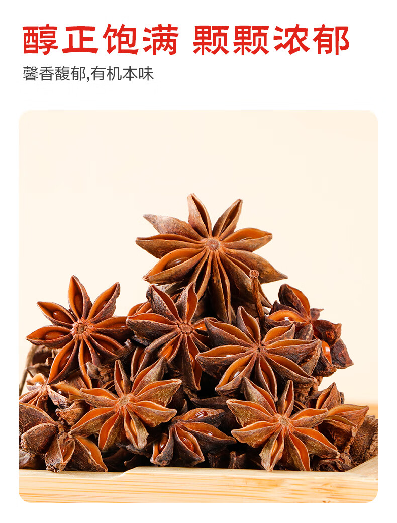 【批发优选】大量供应100克瓶装有机八角,支持定制标签和包装,满足不同销售渠道的需求。凭借广西防城港的地理优势和有机种植基地,我们能提供稳定的产品供应和有竞争力的批发价格。