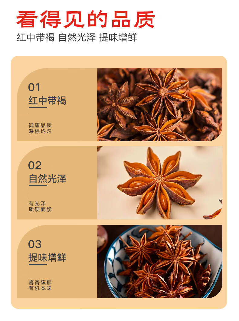 【炖肉佳品】50克瓶装有机八角是制作红烧肉、炖牛肉等中式炖菜的必备调料,其浓郁的甘草香味能有效去除肉类腥味,提升菜肴的层次感。瓶装设计便于保存,确保每次使用时都能享受到新鲜的八角香气。