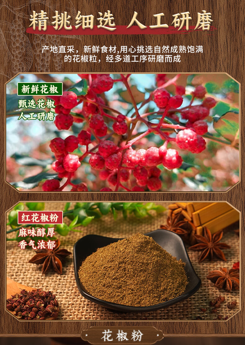 【储存优势】散装花椒粒采用密封包装,能有效防止香气流失和受潮变质。在阴凉干燥处妥善保存,可长期保持花椒的新鲜度和浓郁香气。散装设计便于根据实际需求取用,避免浪费,是家庭和餐饮业的理想选择。