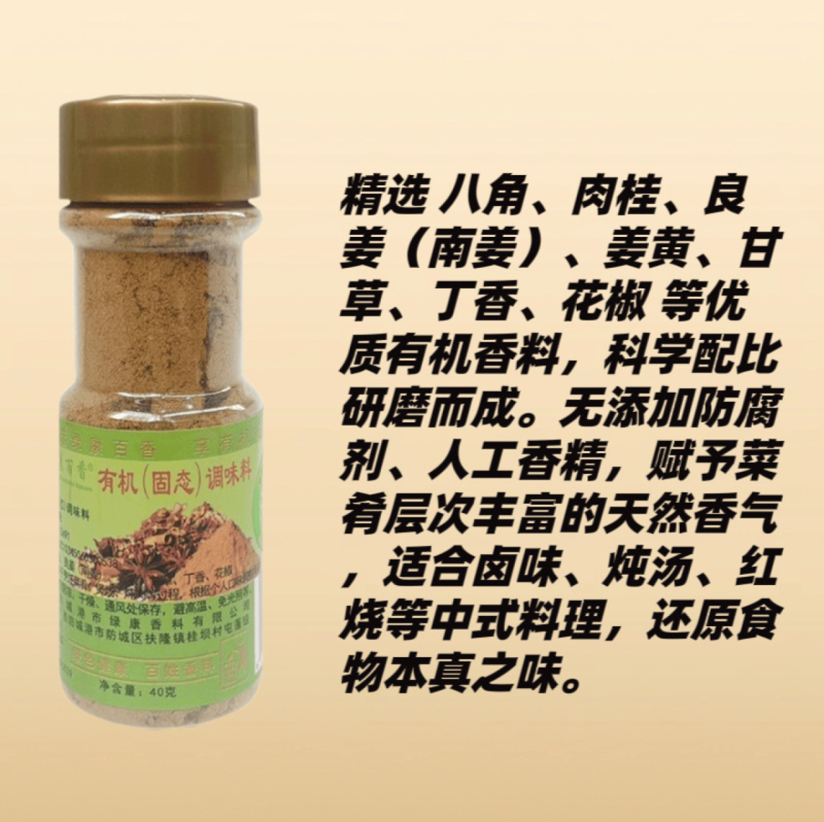传统五香配方,风味均衡,腌制/家常烹饪皆宜。